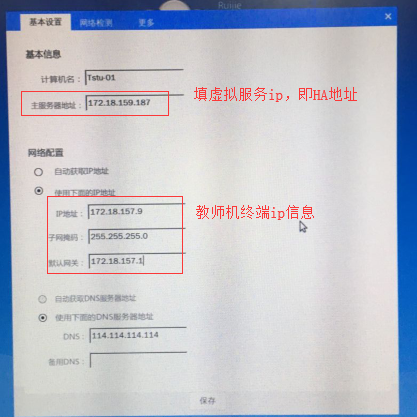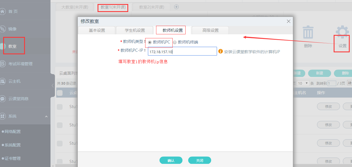 用HA虚拟服务IP访问云主机web->教室->教室1->设置->教师机设置->教师机终端->填写IP信息。