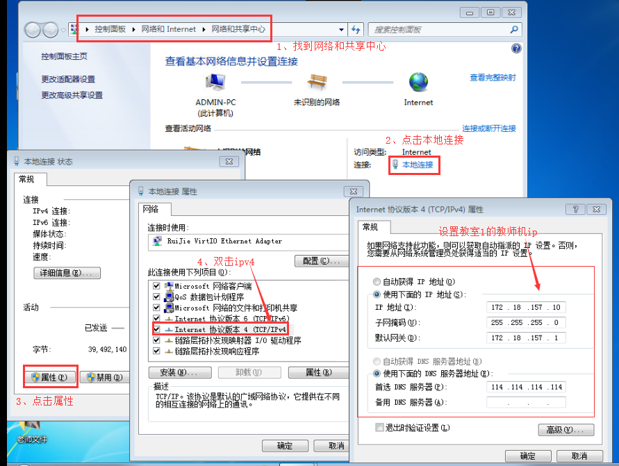 此时将教师机pc电脑的IP改成是和web设置一致。