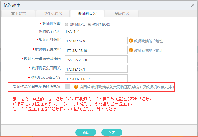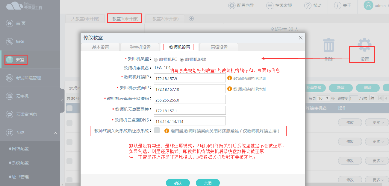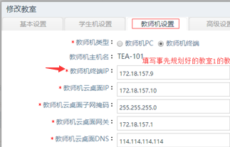 注:教室2的教师机配置和教室1配置步骤类似,只需要在服务器web>>教室2,设置事先规划好的教室2的教师机终端IP和云桌面IP和对应教师机终端上的终端IP和主服务器IP。不再重复描述。