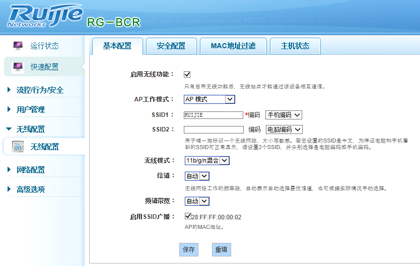 进入设备设置SSID为RUIJIE,开启无线和SSID广播功能,其他保持默认