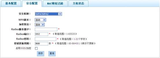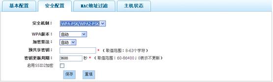 提示:只有当AP工作模式为“AP”时,才支持WPA/WPA2安全机制;其它工作模式下,均不支持WPA/WPA2安全机制。
