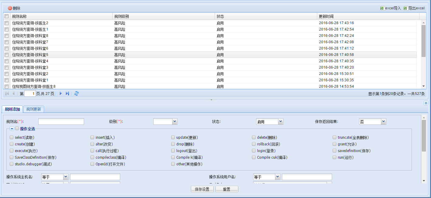 DBS默认有各个HIS厂家统方规则库,以及数据库安全规则、SQL注入规则等
