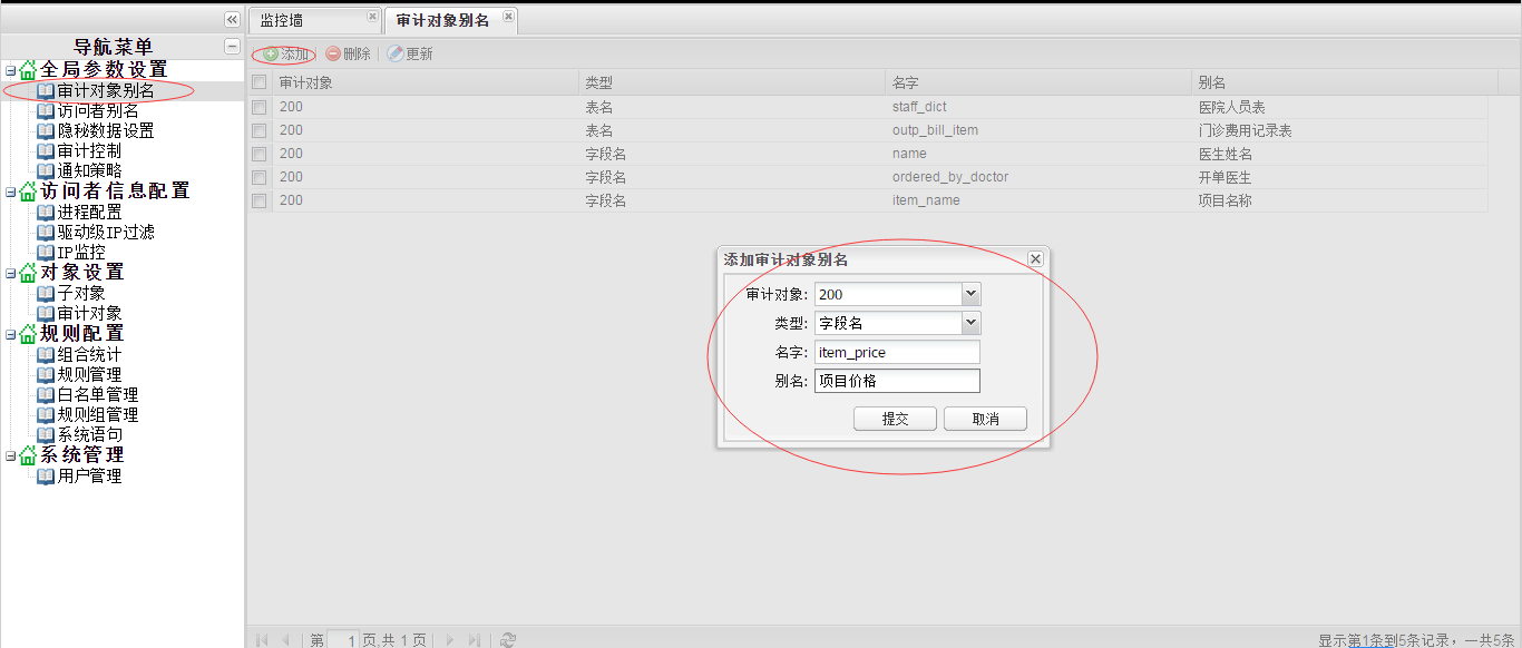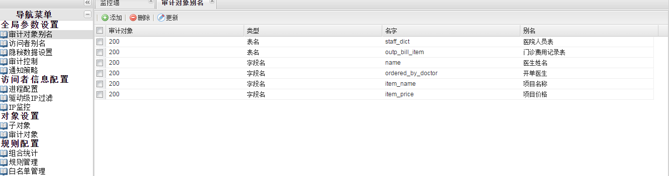 点击“全局参数配置”-“审计对象别名”,打开“审计对象别名”配置界面,点击“添加”,对敏感表、字段设置一个别名,系统可以将表、字段和关键字来配置别名,设置关键字的目的是因为数据库语句中有些英文字符既不是表,也不是字段,这个时候如果要设置别名,就可以通过关键字来定义。