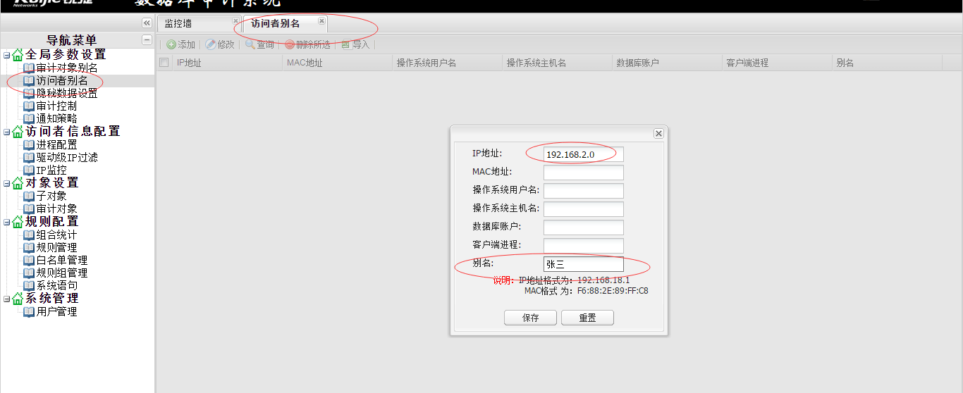 点击“全局参数配置”-“访问者别名”,打开“访问者别名”配置界面,访问者别名设置,将IP地址翻译成中文,方便在审计结果中直观的看到是谁操作了数据库。