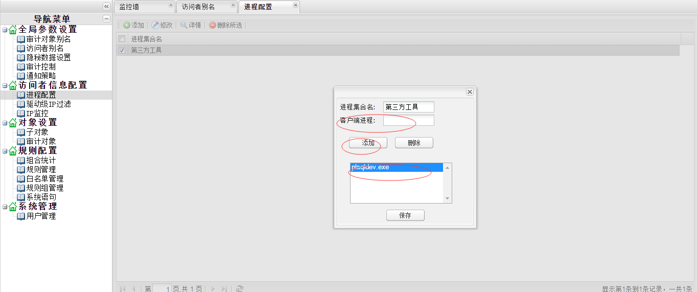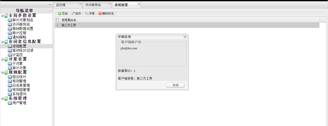 点击“访问者信息配置”-“进程配置”,打开“进程配置”界面,添加进程集合,进程集合名可以自定义,这里配置为“第三方工具”,然后点“客户端进程”的下拉选项,选择“plsqldev.exe”,最后点“添加”按钮。一个集合中可以添加多个进程。