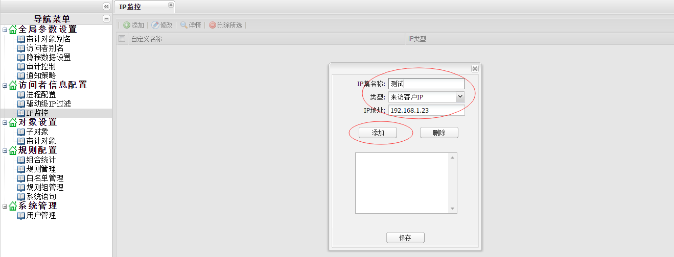先添加应用服务器IP,选择“来访客户IP”,输入应用服务器的IP地址“192.168.1.23”,点“添加”,再点“保存”