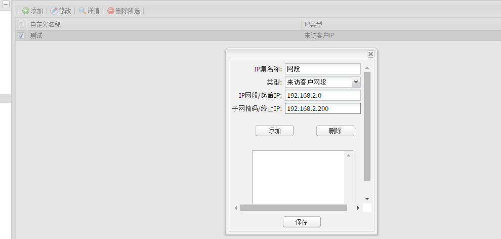 继续添加上面需求中提到的IP网段,192.168.2.0-192.168.2.200,类型选择“来访客户网段”,把起始IP和终止IP输入后,点击添加,保存即可。