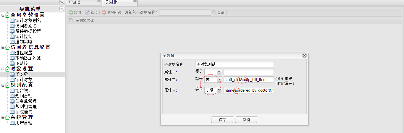 根据需求中提到的2张表和4个字段,同时满足时告警,他们之间是与(&)的关系,可以在子对象中进行设置。如下图所示,多张表或字段用“&”符合隔开,点击保存即可,