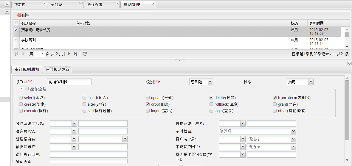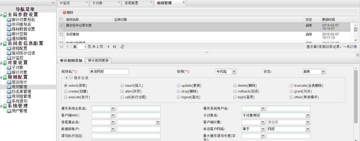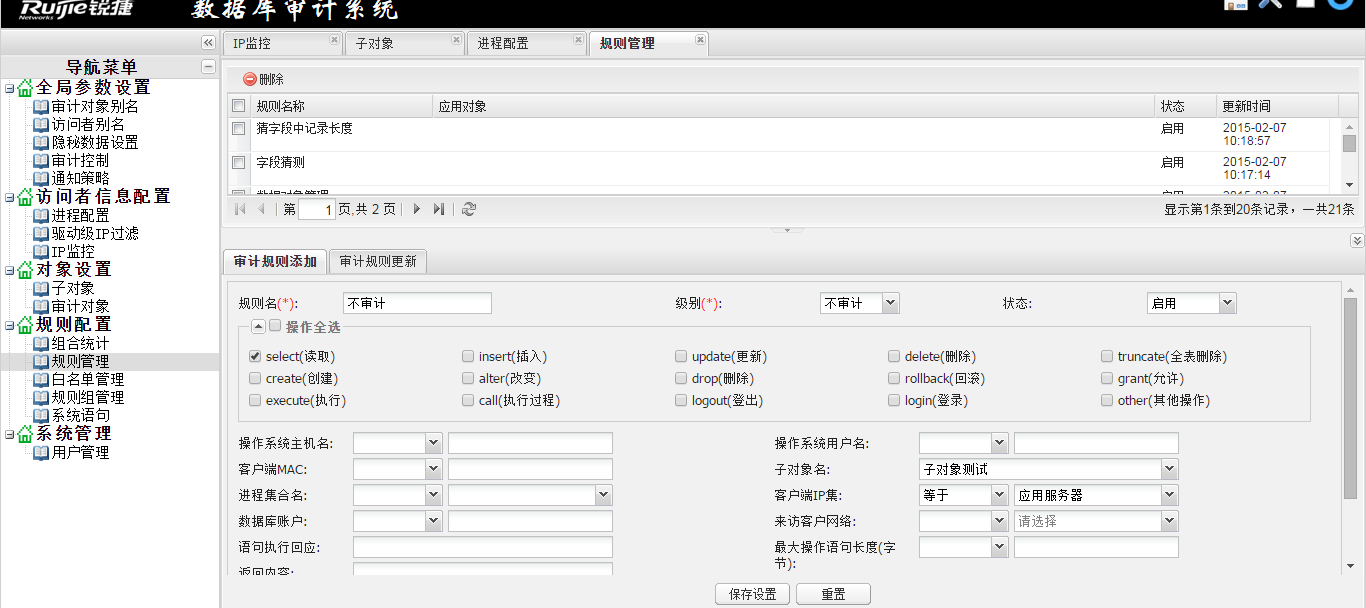 添加规则方式同需求1,添加规则名“192.168.2.0网段操作”,设置风险级别“中风险”,选择操作类型“select”,然后调用之前配置的子对象和IP集合,最后保存设置。如下图所示,
