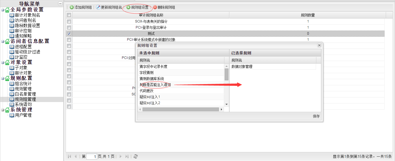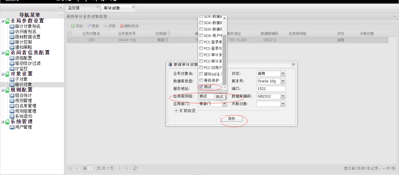 打开“对象设置”-“审计对象”,打开“审计对象”界面,选择对应的数据库,点击“应用规则组”,然后选择“某客户规则组”,点击“保存”按钮即可,