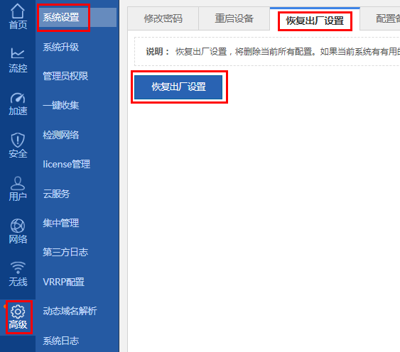 注意:恢复出厂设置后,原来的配置会清空。若配置比较重要,请先参日常考维护章节的配置备份;