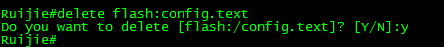2)在ruijie#模式下,输入命令 delete flash:config.text,在提示是否确认删除文件时,输入Y确认。