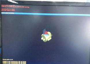 2、等待显示器的机器人显示倒下的画面,将recovery键松开,按一下电源键;
