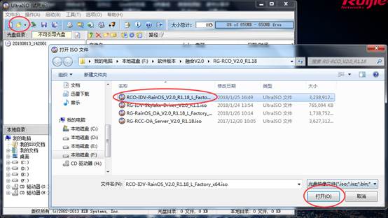 1、在windows系统上安装UltraISO刻录软件。插入U盘(≥4G),并打开UltraISO刻录软件,选择菜单栏的文件打开,打开的终端镜像文件,如下图: