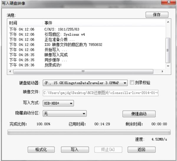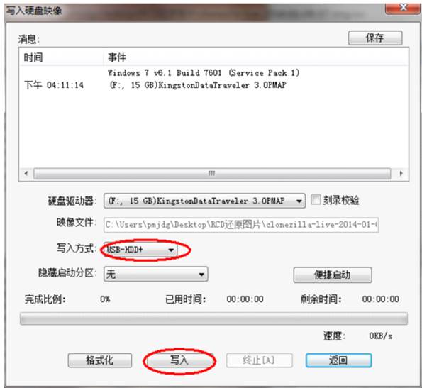 2、选择菜单栏的启动---写入硬盘映像,出现如下窗口,写入方式选择USB-HDD+,然后点击写入按钮。提示U盘上数据将丢失,是否继续,点是,开始进行刻录。