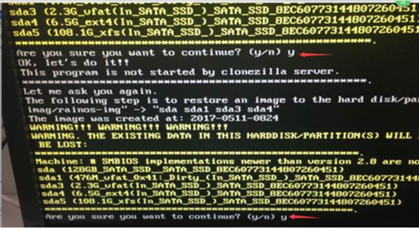 6、到以下两个步骤时需要分别输入“y”终端进行刷机操作: