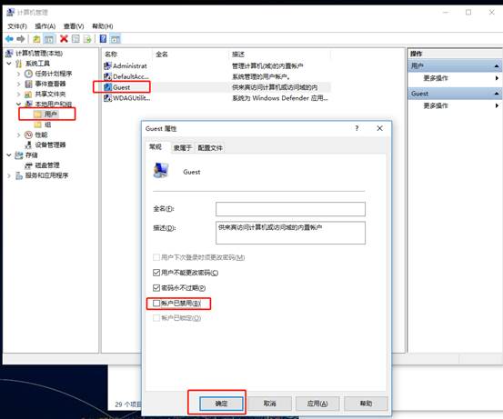 2、在弹出的【计算机管理】在本地用户和组列表中找到【Guest】用户,双击【Guest】,打开【Guest属性】窗口,确保【账户已禁用】选项没有被勾选,如下图: