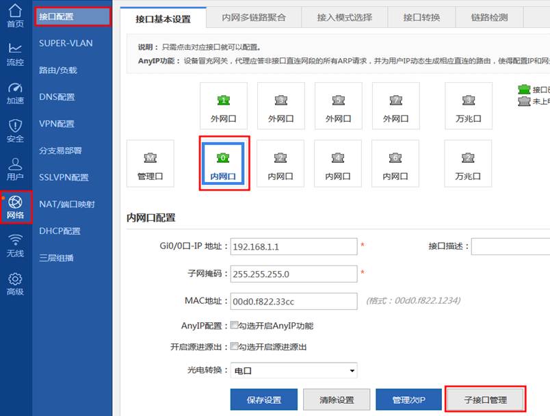 1)首先,经过快速配置让设备自动下发nat的相关配置,然后在接口配置中选择内网口进行子接口的配置: