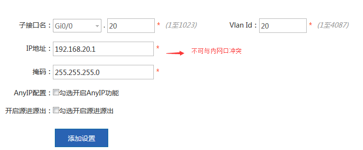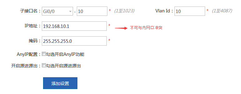 子接口名称:填写范围是1至1023,建议与 VLAN ID 保持一致;