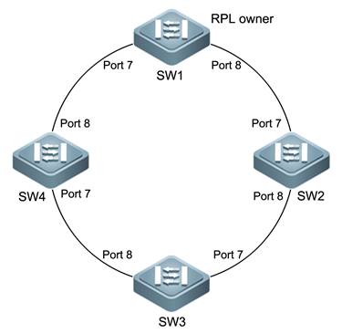 环网中提供冗余链路,在网络单链路中断时,进行快速切换,使用备用链路通信,为此需要部署ERPS功能,根据组网topology,SW1-SW4的端口7为west端口,端口8为east端口。SW1为RPL