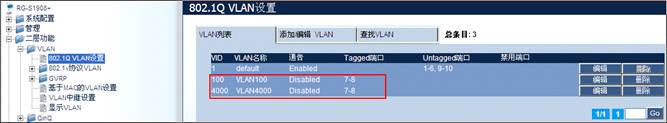1、参见"802.1Q VLAN"配置实例,通过点击“802.1Q VLN设置” 创建VLAN100和VLAN4000,并将在创建的两个VLAN中添加tagged成员端口7和8。