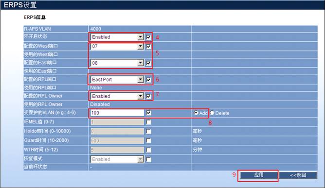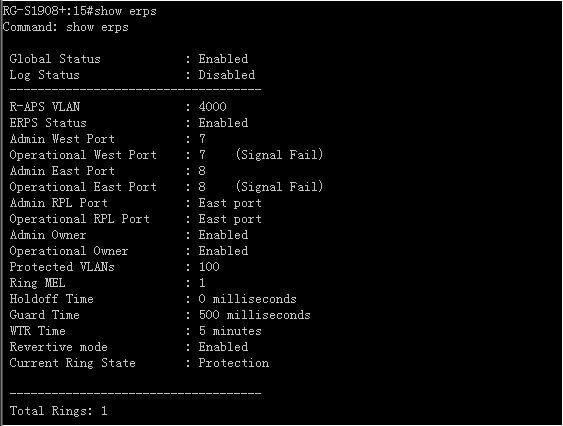 RG-S1908+:15#config erps raps_vlan 4000 ring_port east 8------>配置R-APS VLAN 4000中的端口8为east环端口