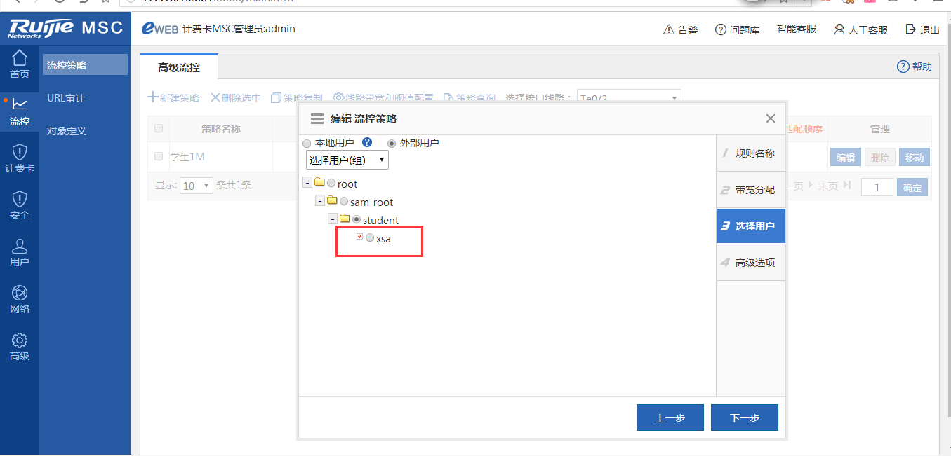step5、首次实施的时候,外部用户组里面是没用SAM上面的任何组织架构信息,所有需要定义一个IP段来挑选出这部分流量,让流控先生效,这样MSC上面就可以看到SAM同步过来的用户信息组,然后在重新编辑修改策略,在MSC上选择相应的SAM上面的组织,再做细化的 精细的流控策略