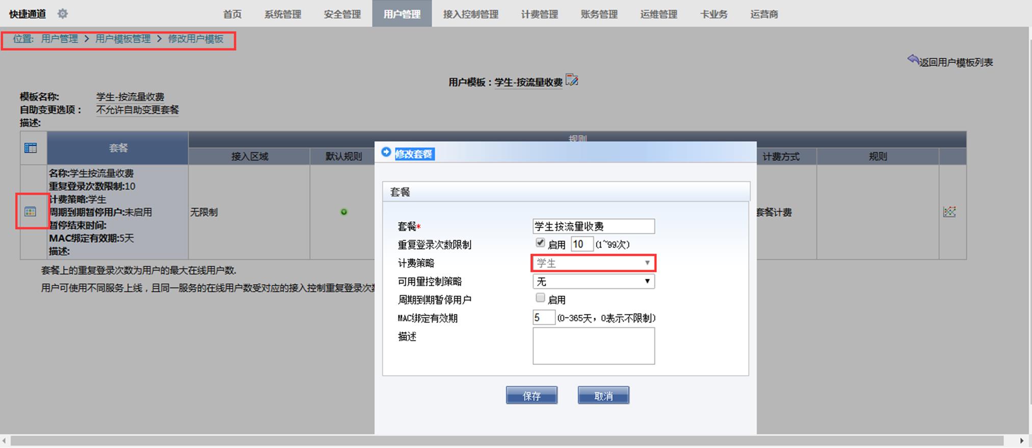 step5、用户模板套餐中关联计费策略