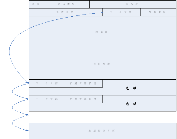 如图,这些扩展首部放置在IPv6首部和上层协议首部之间,每个扩展首部的“下一个首部”字段指明下一个扩展首部的类型。