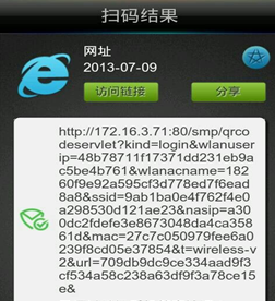 第四步:内部员工使用扫描软件对二维码图案进行扫描,获取到该二维码图案中所含的URL信息点击认证,提交UserIP、MAC地址、NASIP到SMP中去读取访客的流水号(目的是为了创建一个访客账号,会以流水号进行命名,例如扫描者_访客_1,扫描者_访客_2,扫描者_访客_3,以此类推,次流水号即为访客的上网账号。)