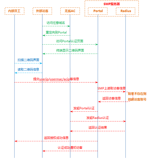访客二维码授权可以总结为一句话:内部员工协助访客提交用户身份信息的二代Portal认证