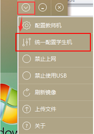 1、开启所有云终端,打开Teacher软件,进入统一配置的菜单项(终端进行“下课”操作后,才会显示该选项):