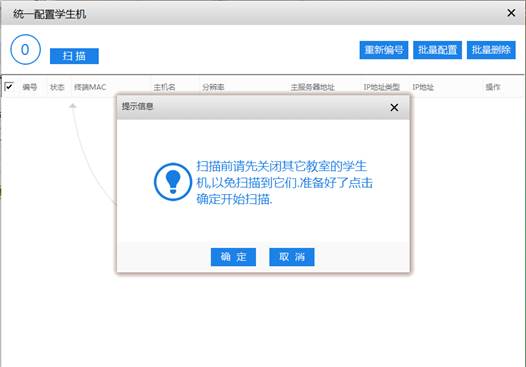 1、统一配置之前,先将教室的外联网线拔掉,防止扫描到其他教室的终端;
