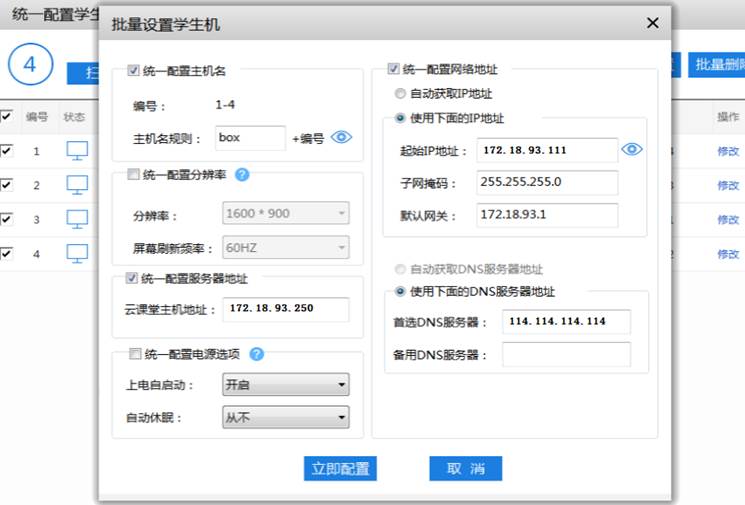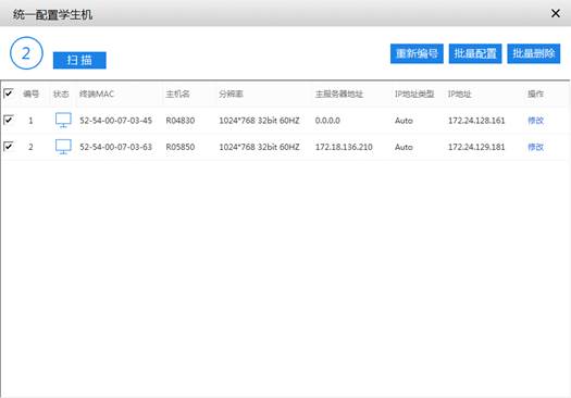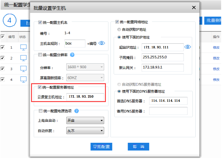 4、自动编号后,进入批量配置,该功能能够配置所有勾选的学生机的主机名、分辨率、主服务器地址、IP地址等。