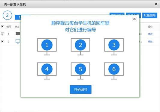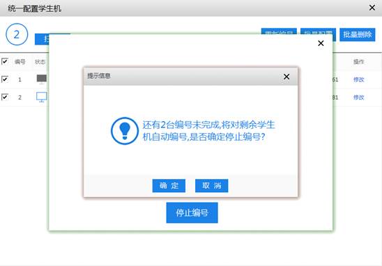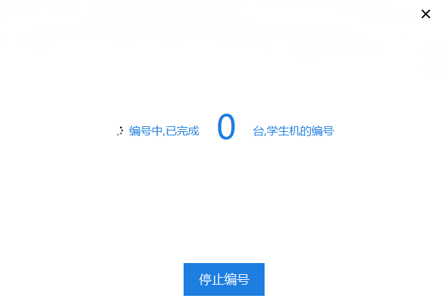当所有学生机完成编号,会自动关闭编号页面,完成编号操作;或者也可以点击停止编号,结束编号操作,这时会对剩余的学生机自动编号,完成编号操作。
