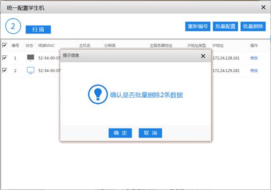 5、若教师增加或更换设备后,可以进行批量删除,重新扫描进行配置。(批量删除后,终端编号也会一起删除)