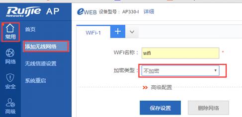 Wifi密码:建议用英文和字母组合,不建议用特殊字符(部分终端可能由于特殊字符无法连接上无线信号) 注:必须要配置,大于7位小于64位,若要不加密信号,在完成配置后,常用---添加无线网络---改为不加密