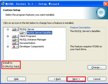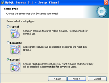 说明:强烈建议使用Custom(自定义安装)选项,最好把MySQL的Datafiles(数据文件)存放到非系统盘符(本文档以D盘创建MySQL