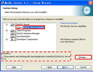 3、在出现的Custom Setup(自定义安装)界面中,请选择[MySQL Server Datafiles] (MySQL数据文件)标题,并点击<Change>(更改安装路径)按钮。