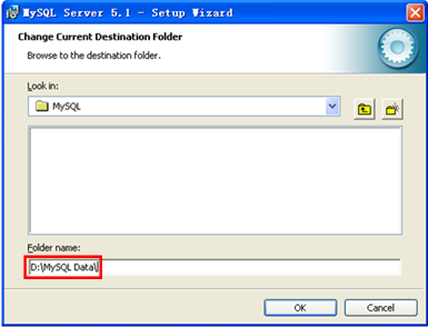Server Datafiles](MySQL数据文件)的安装的目标文件夹,并点击[ok]按钮完成指定磁盘路径。