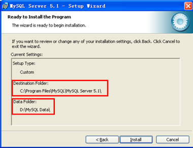 说明:以上图中Destination Folder代表MySQL的主程序文件的存放目录,Data