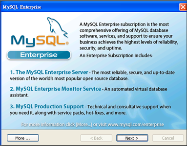Enterprise(MySQL企业版)界面,此界面介绍MySQL Enterprise(版本)信息,请点击[Next]。