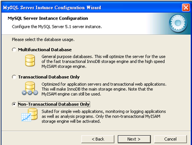 usage(数据库用途),请选择Non-Transactional Database Only(禁用于非事务性数据库),再点击[Next]。