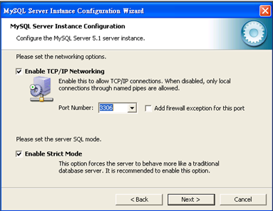 TCP/IP Networking(使用TCP/IP网络),并将port number(端口数)保持默认值为3306。另外还需勾选Enable Strict