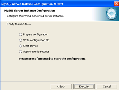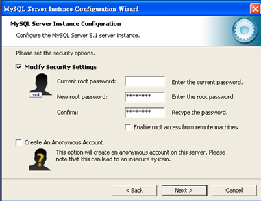options(安全选项),请选择Modify Security Settings(修改安全设置),并在此界面为MySQL数据库的root账号自行设定一个密码,再点击[Next]。