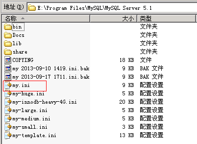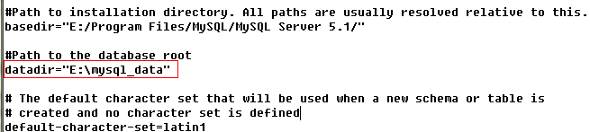 4、找到MySQL的安装目录,修改MySQL配置文件 my.ini找到 datadir="D:/Program Files/MySQL/MySQL Server 5.1/Data/" ,以上标红字体为我的主机MySQL的数据目录,将其改为更改后的data路径