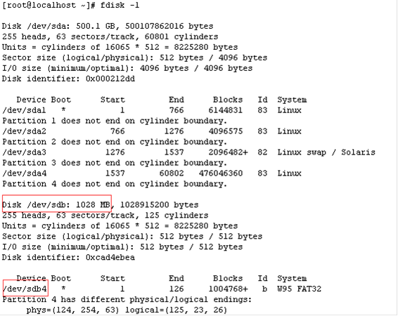 2)fdisk -l 查看硬盘U盘的盘符,可通过U盘大小区分盘符