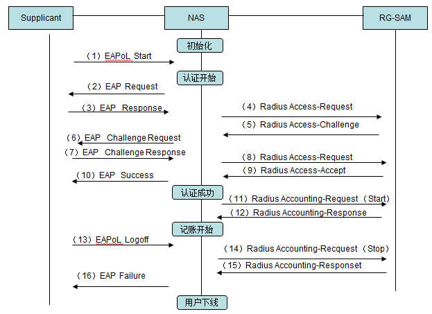 RG-SAM基于IEEE-802.1X标准与RADIUS协议进行开发,并在这两个协议的基础上进行了扩展,加入了很多锐捷独有的特色功能。