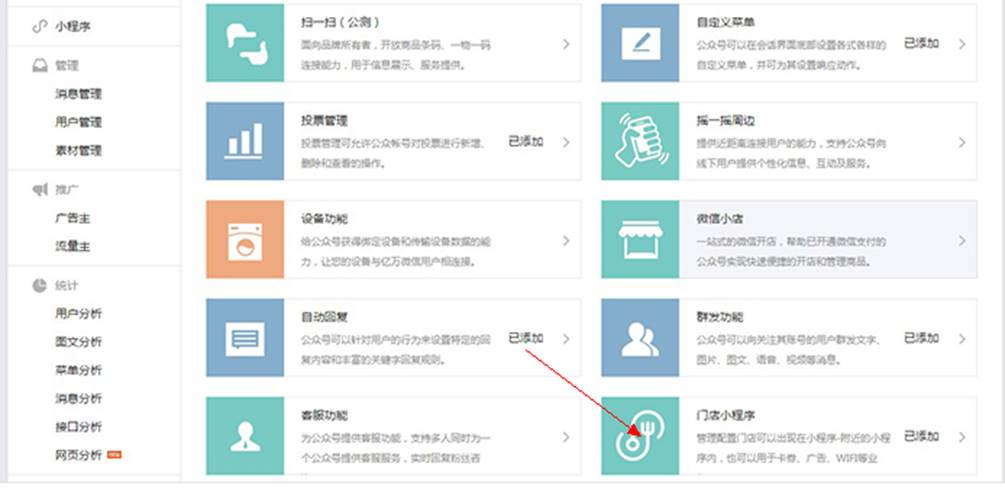 在“添加功能插件”—“门店小程序”申请开通。