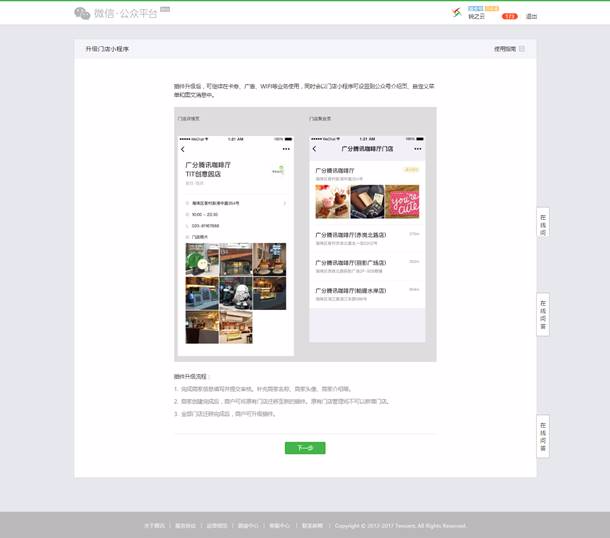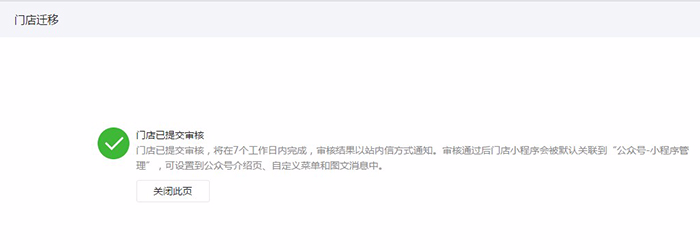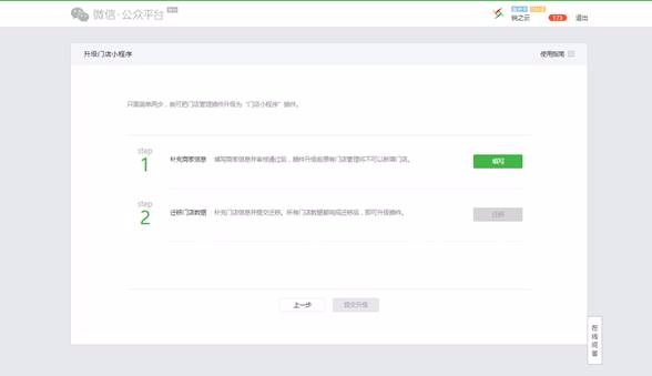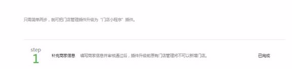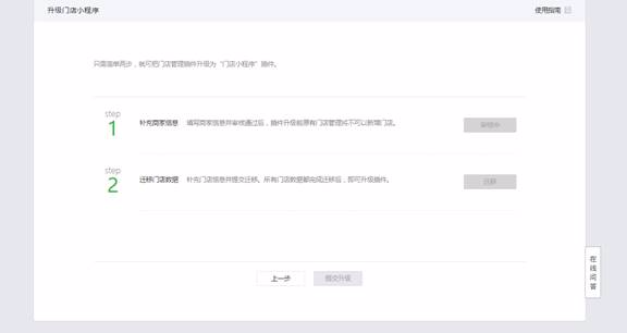 商家创建完成并审核通过后,进入第二步迁移门店:即通过补充门店相关信息完成迁移升级为门店小程序插件。